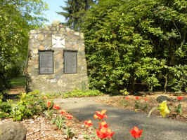 In einer kleinen gepflegten Anlage Ehrenmal für die 11 bzw. 23 Kriegstoten beider Weltkriege.