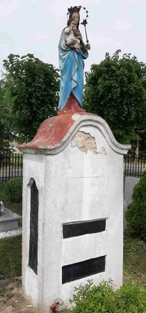 Nach 1945 wurde in Ostpreußen die deutsche Bevölkerung vertrieben und die meisten Denkmäler abgerissen, beschädigt oder umgewidmet. Hier fehlt wahrscheinlich die ursprüngliche Widmungstafel und die Marienfigur wurde nach 1945 aufgesetzt. Informationen zur ursprünglichen Widmung werden gesucht.