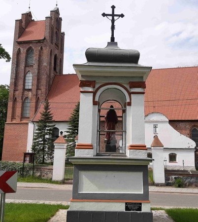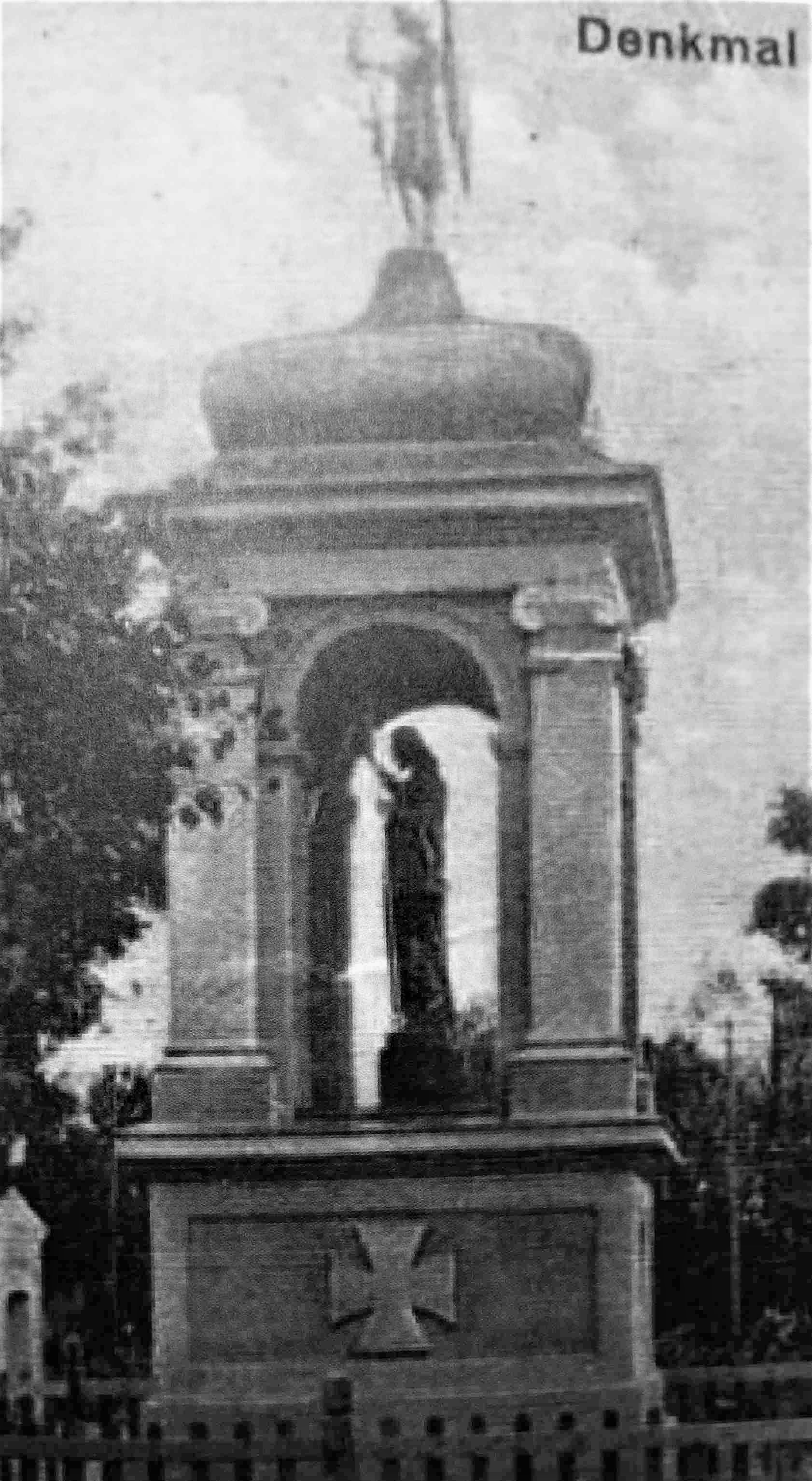 Denkmal für die Gefallenen des Ersten Weltkriegs vor der Kirche: Tempelartiger Bau mit einer Jesus-Figur innen, einer krönenden Siegesgöttin und EK-Zeichen unten. Heute ohne Siegesgöttin, EKs und Inschriften.