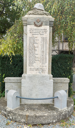 Vor der Westseite der Dorfkirche in Tonndorf steht das Kriegerdenkmal für die Gefallenen des Ersten Weltkrieges. Es wurde saniert und am Volkstrauertag 2021 eingeweiht. Ein paar Stufen führen von der Straße her zu ihm hin. Der Obelisk besteht aus Kalkstein und ist vor eine kleinen Hecke platziert. Davor wird er von einem angedeuteten Zaun aus zwei steinernen Stützen mit einer Eisenstange geschützt. Den Abschluss des Denkmals bildet ein Stahlhelm, der auf Eichenlaub gebettet ist. An der Schauseite befindet sich eine geglättete Tafel, die die Namen der Kriegsopfer enthält. Den oberen Abschluss dieser Tafel bildet ein Eisernes Kreuz über Eichenlaubzweigen. Diese beiden Teile sind aus Metall.