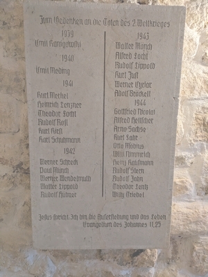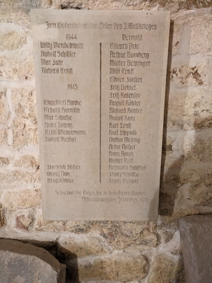 In der Kirche wurden zwei steinerne Tafeln angebracht, die Daten zu den Gefallenen des Zweiten Weltkrieges beinhalten.