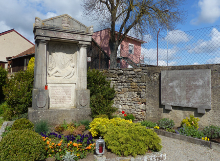 1. Weltkrieg: Einem Tempeleingang nachempfunden. Zwischen zwei Säulen befindet sich eine Sterbeszene. Darunter die Namen. Links und rechts davon zwei erhabene und ovale Flächen mit Namen von zwei in der Heimat Verstorbenen.
