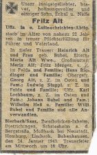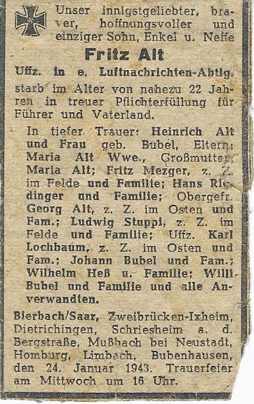 Uffz. | ALT | Fritz | 24.03.1921 Bierbach (St. Ingbert) | 24.01.1943 Res. Laz. Kaiserslautern |