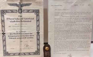 Für Führer, Volk und Vaterland starb den Heldentod am 17. Oktober 1943 der Oberleutnant (Ing.) d.R. Erich Bethke. Im Auftrage des Oberbefehlshabers der Kriegsmarine ist darüber diese Urkunde ausgestellt worden. Kiel den 7. Juli 1944