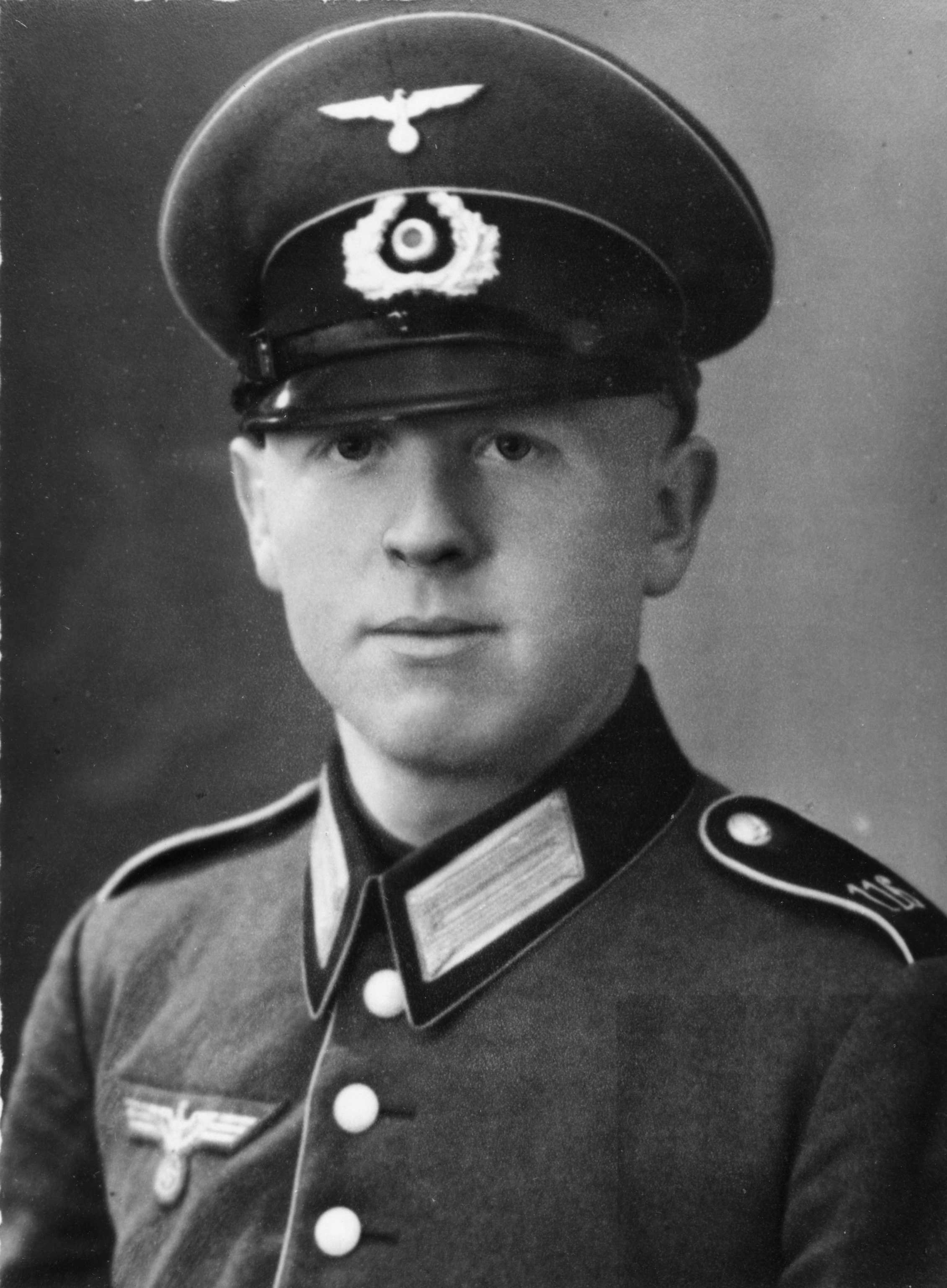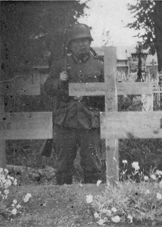 Das Schwarzweißfoto zeigt Willi Sticher am Grab seines gefallenen Bruders. Willi Sticher wird seit April 1945 im Osten vermisst.