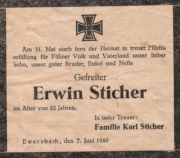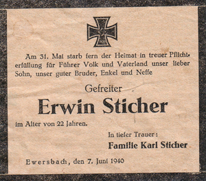 | Gefreiter | STICHER | Erwin Karl | 02.12.1917 Straßebersbach, Hessen | 31.05.1940 Bauquesne, Frankreich Beauquesne | 14. Komp., IR116 | starb als Kradmelder, Kriegsgräberstätte in Bourdon: Block 41 Reihe 6 Grab 212 |