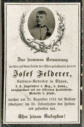 k. k. Zugführer | FELDERER | Josef | 21.12.1914 | 3. Reg., 3. Komp. | ausgezeichnet mit der silbernen Tapferkeits-Medaille 2. Klasse |