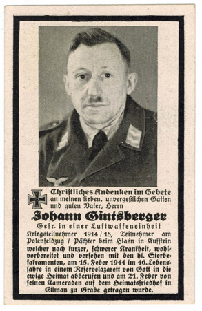 Gefreiter | GINSTBERGER | Johann | 15.02.1944 Reservelazarett | Luftwaffe | im 46. Lebensjahr, an Krankheit gestorben, bestatten auf dem Heimatfriedhof in Ellmau |