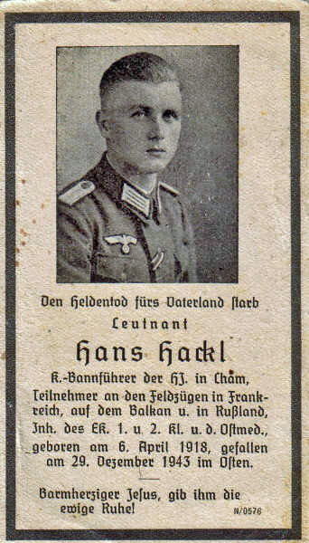 Leutnant | HACKL | Hans | 06.04.1918, Seinsfeld Furth im Wald | 19.12.1943 im Osten Jassinowyj |
