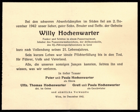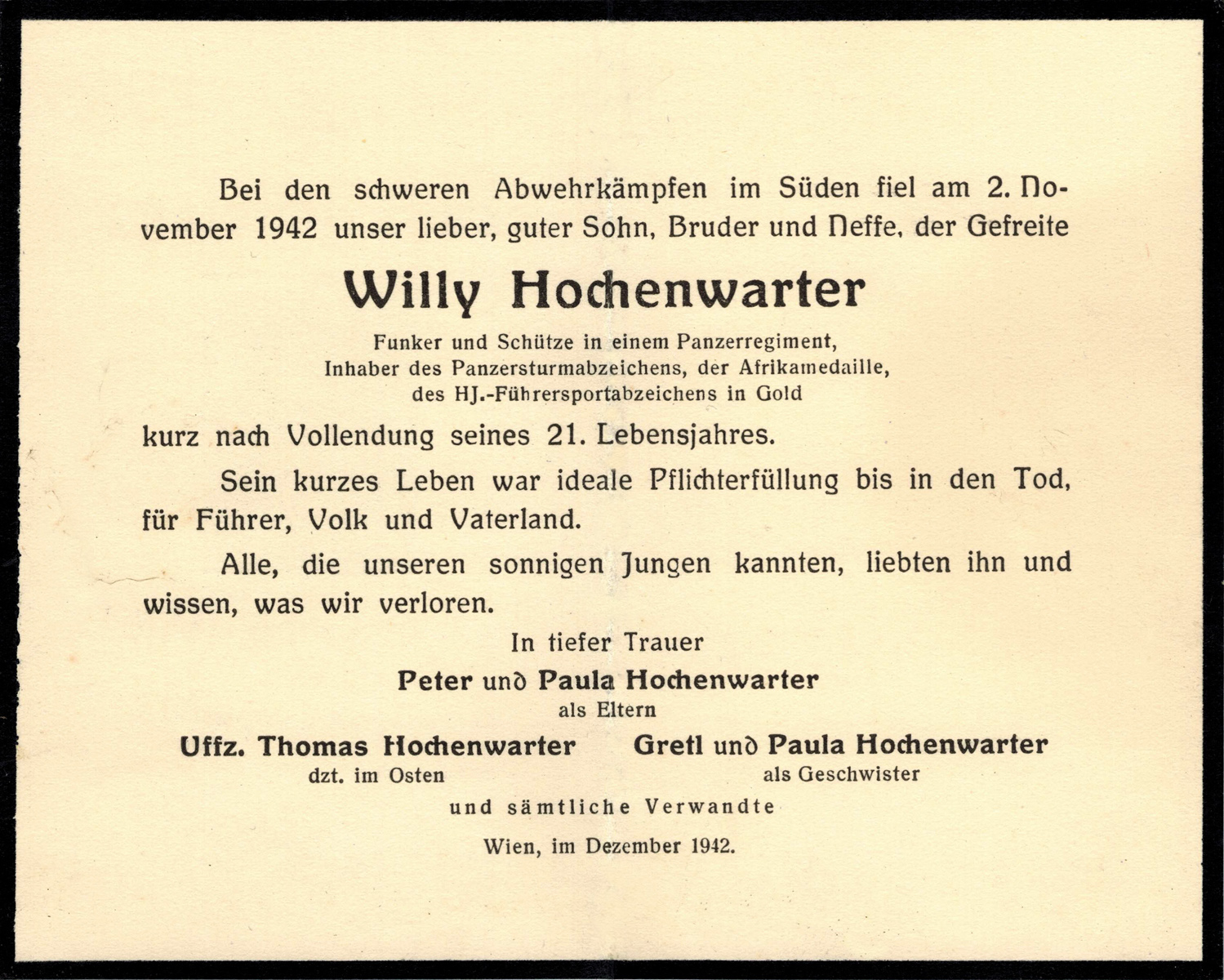 Gefreiter | HOCHENWARTER | Willy | 15.10.1921 | 02.11.1942 im Süden |