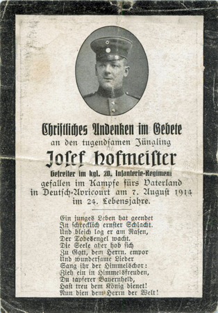 Gefreiter | HOFMEISTER | Josef | 08.02.1891 Harthausen | 07.08.1914 Deutsch‑Avricourt, Frankreich | kgl. 20. Infanterie‑Regiment | Bruder von Georg Hofmeister: Kriegsgräberstätte in Reillon, Kameradengrab |