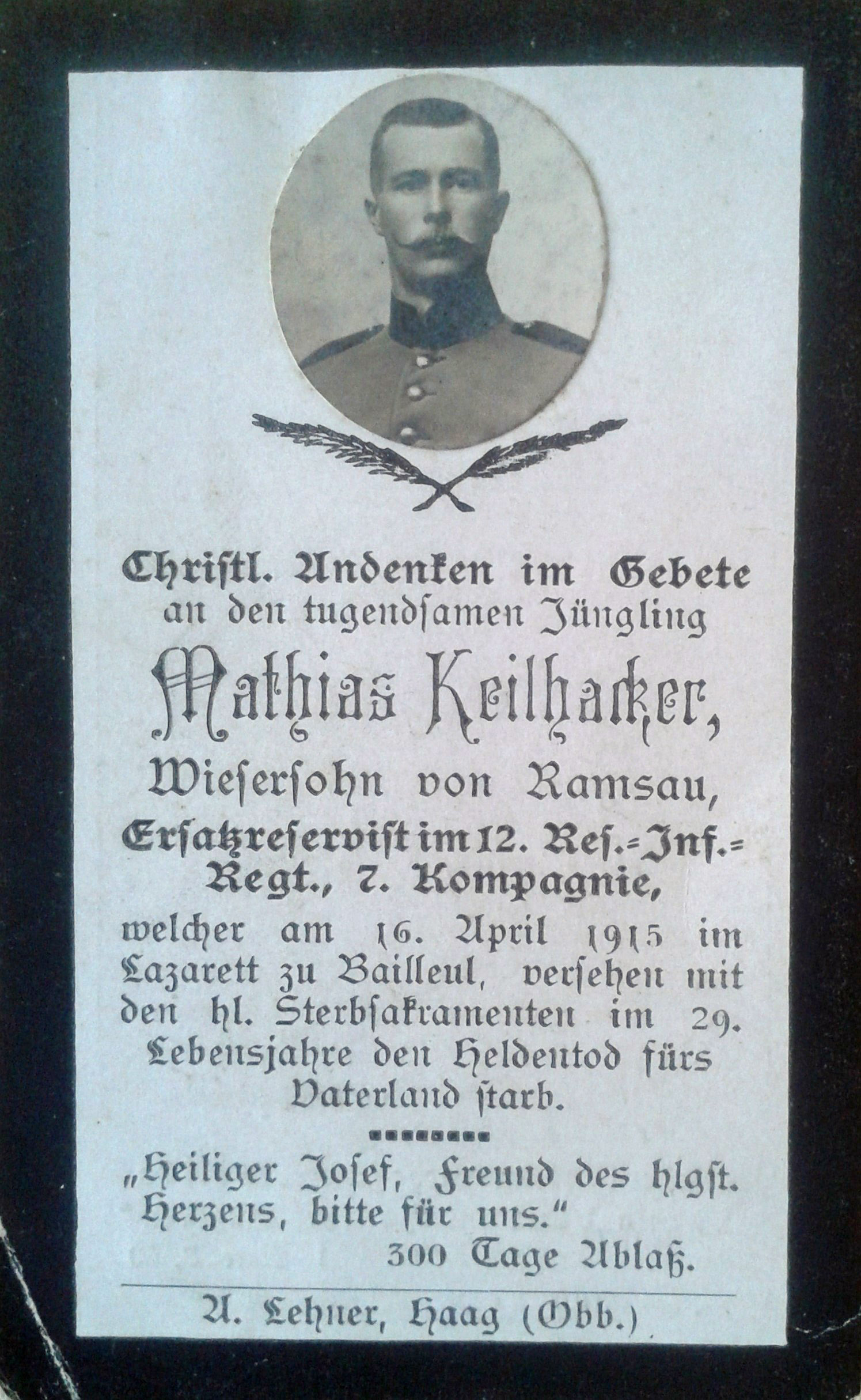 12. Infanterie-Regiment, 7. Kompagnie | Wiesersohn von Ramsau; beerdigt: Kriegsgräberstätte Neuville-St.Vaast, Block 10 Grab 504 |