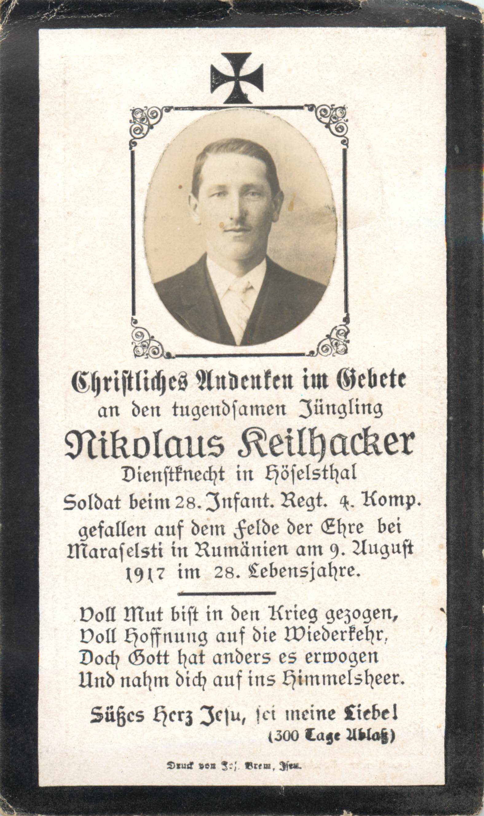 Soldat | KEILHACKER | Nikolaus | 31.10.1889 Esterndorf (Pf. Oberdorfen) | 09.08.1917 bei Marasesti, Rumänien |