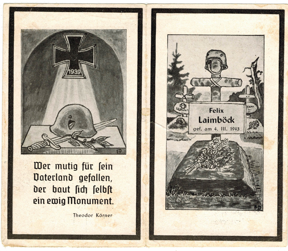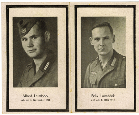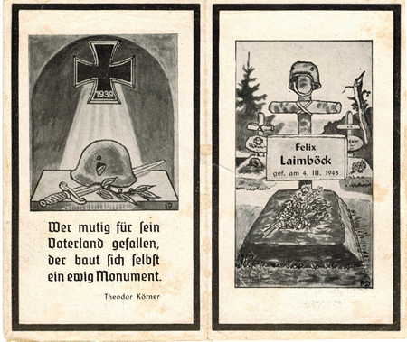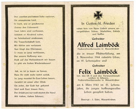 Gefreiter | LAIMBÖCK | Alfred | 03.11.1944 östwärts Libau | Fischereibesitzerssohn in Mauerkirchen, im 19. Lebensjahr | |