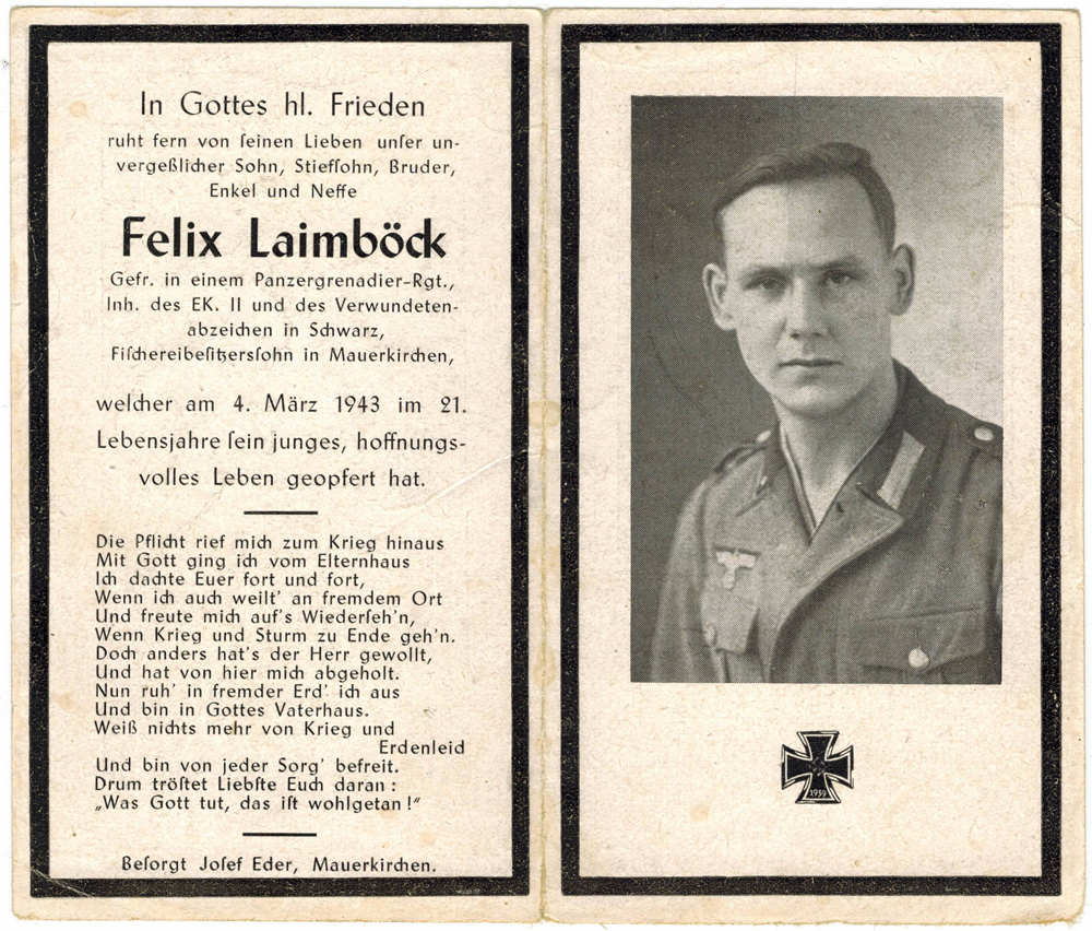 Gefreiter | LAIMBÖCK | Felix | 04.03.1943 | Panzergrenadier‑Regiment | Fischereibesitzerssohn in Mauerkirchen, im 21. Lebensjahr |