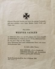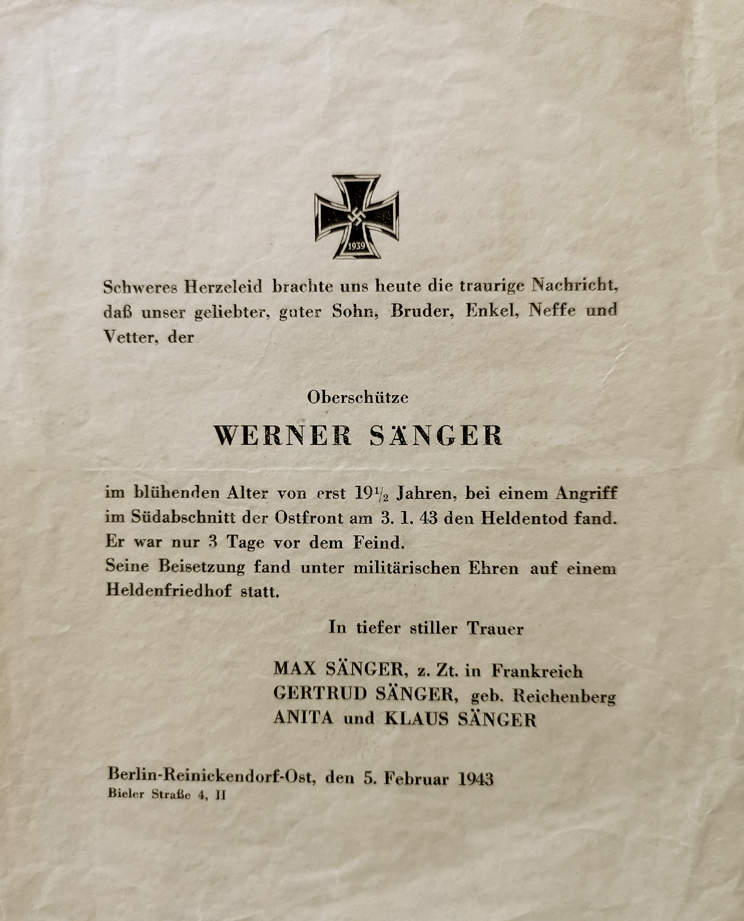 Oberschütze | SÄNGER | Werner | 17.07.1923 Sonnenburg, Kreis Ost-Sternberg | 03.01.1943 Südabschnitt der Ostfront Nowospassowka |