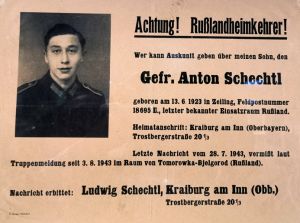 03.08.1943 Raum Tomorowka-Bjelgorod (Rußland) | Letzte Nachricht vom 28.07.1943, vermißt, Feldpostnummer 18 695 E. Vater: Ludwig Schechtl, Kraiburg am Inn (Obb.), Trostbergerstr. 20 |