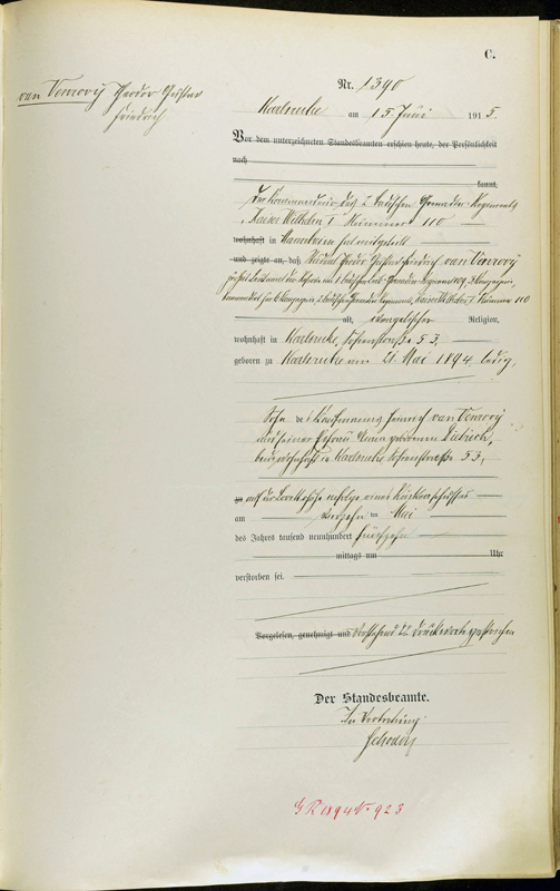 6. Kompagnie, 2. Badischen Grenadier-Regiment "Kaiser Wilhelm I", No. 110 | Student, ledig, Sohn des Kaufmanns Heinrich van Venrooÿ und seiner Ehefrau Anna, geb. Dietrich |