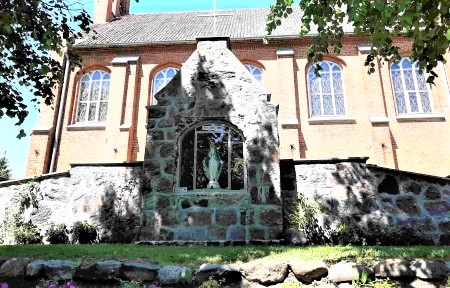 Denkmal für die Gefallenen des Ersten Weltkriegs integriert in die Kirchhofmauer: Aus Natursteinen gemauerter Quader mit Spitzdach und daran angebrachte Widmungs- und Namenstafel und darüber hängendem EK-Zeichen. Tafel und EK wurden nach 1945 abgerissen, der Quader ausgehöhlt und eine Marienfigur mit Glasfenster dort eingesetzt.