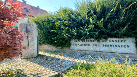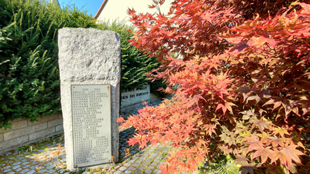 Auf einer Seite des behauen Steins ist ein christliches Kreuz angebracht. Die Namen der Gefallenen beider Weltkrieg stehen auf zwei aufgesetzten Platten.
