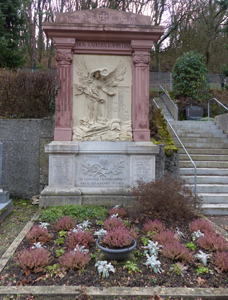 Im Eingang ein Engel der über Ausrüstungsgegenständen steht und einen Lorbeerkranz hebt.