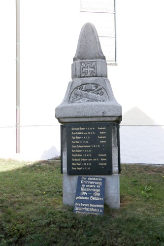 Das Denkmal für die Gefallenen des Zweiten Weltkriegs besteht aus einem großen Steinkreuz mit der Widmung und zwei einfachen Steinen mit den Namen. Auf dem linken stehen die Gefallenen von Oberkoskau, auf dem rechten Stein die Gefallenen von Unterkoskau.