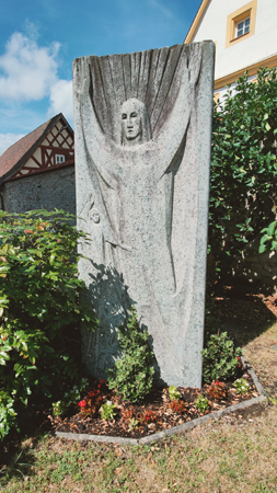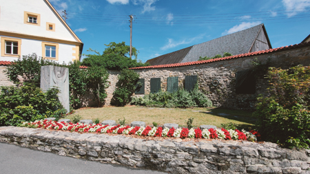 Denkmal für beide Weltkriege bei der evangelischen Pfarrkirche St. Oswald. Platten für beide Weltkriege an der Mauer.