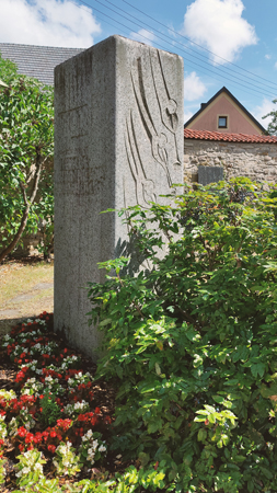 Gedenksteine (Grabsteine?) für Gefallene, die auch auf den Tafeln verzeichnet sind, am vorderen Rand der kleinen Anlage. Moderne Stele mit Inschrift.