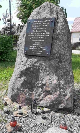 Denkmal zur Erinnerung an die Kämpfe bei Usdau 1914: Aufgerichteter Findling mit angebrachter Widmungstafel, errichtet 2009.