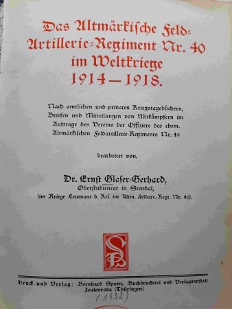 Das Altmärkische Feldartillerie-Regiment Nr. 40 im Weltkriege 1914-1918. Nach amtlichen und privaten Kriegstagebüchern, Briefen und Mitteilungen von Mitkämpfern im Auftrage des Vereins der Offiziere des ehem. Altmärkischen Feldartillerie-Regiments Nr. 40, bearbeitet von Dr. Ernst Glaser-Gerhard, Oberstudienrat in Stendal (im Kriege Leutnant d. Res. Im Feldart. Regt. Nr. 40).