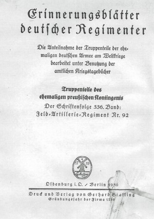 Erinnerungsblätter deutscher Regimenter: das Feldartillerie-Regiment Nr. 92, Oldenburg i.O./ Berlin 1930.