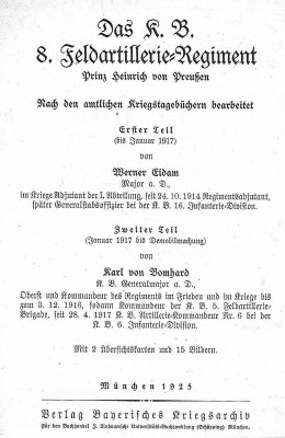 Das KB 8. Feldartillerie-Regiment. Nach den amtlichen Kriegstagebüchern bearbeitet, München 1925, Verlag Bayerisches Kriegsarchiv.