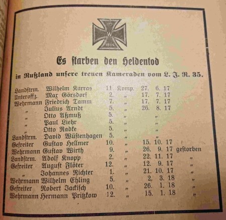 Verlustliste des Landwehr-Infanterie-Regiments Nr. 35 im Ersten Weltkrieg. Notiert aus der Regimentsgeschichte: „Märkische Landwehr. Erinnerungsblätter aus den Kriegsjahren 1914-1918. Herausgegeben von ehemaligen Kameraden des L.I.R. 35“ in 2 Bänden im Selbstverlag. Laut Notiz sind vom Regiment 8 Offiziere, 63 Unteroffiziere und 489 Mann gefallen.