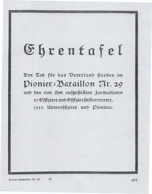 Den Tod für das Vaterland starben im Pionier-Batillon Nr. 29 und den von ihm aufgestellten Formationen37 Offiziere und Offizierstellvertreter,1312 Unteroffiziere und Pioniere