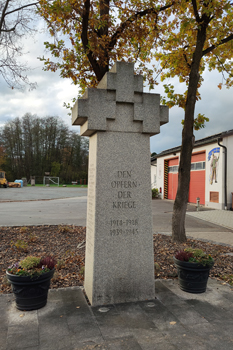 Steindenkmal mit drei Kreuzen als Abschluss neben der Feuerwehr.
