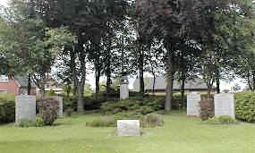 Anlage auf dem Friedhof: Mittlere Steintafel im Vordergrund mit Widmung. Am Fuße des Holzkreuzes im Hintergrund Tafel mit Widmung für Opfer des Zweiten Weltkrieges. Steinmonument davor mit Widmung für Opfer des Ersten Weltkrieges und Namen der Gefallenen und Vermissten. Je 2 Steintafeln links und rechts tragen die Namen der Gefallenen und Vermissten des Zweiten Weltkrieges.