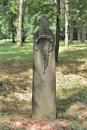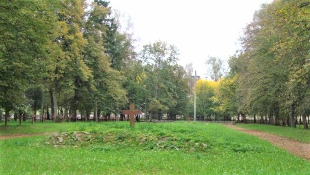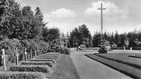 Kriegsgräberstätte für Gefallene des Ersten Weltkriegs: Große längliche Anlage mit hohem Betonkreuz und umlaufend Holzkreuzen (ohne Namen). Nur zwei private Grabsteine sind noch mit Namen erhalten.