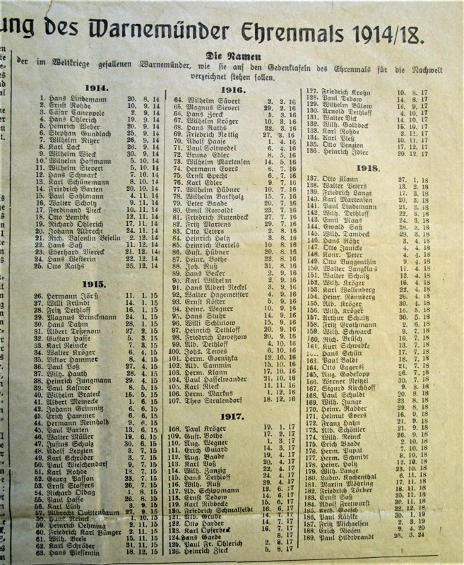 Quelle 6: Ehemaliges abgerissenes Kriegerdenkmal für die Gefallenen des Ersten Weltkrieges aus der Sammlung „Archiv Heimatmuseum Warnemünde“, Bild zu den Namen (nur Ausschnitt) siehe unter www.ortschroniken-mv.de/index.php/Datei:Kriegerdenkmal_Warnemuende_Namen.jpg.