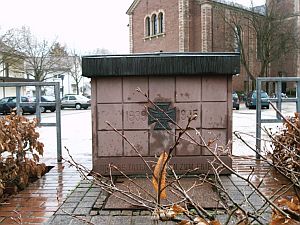 Quadratisches Denkmal am Rand des Kirchplatzes.