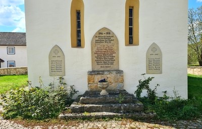 An der Ostseite der nach 1993 renovierten und restaurierten Kirche befindet sich ein Denkmal für die Gefallenen der beiden Weltkriege des 20. Jahrhunderts.