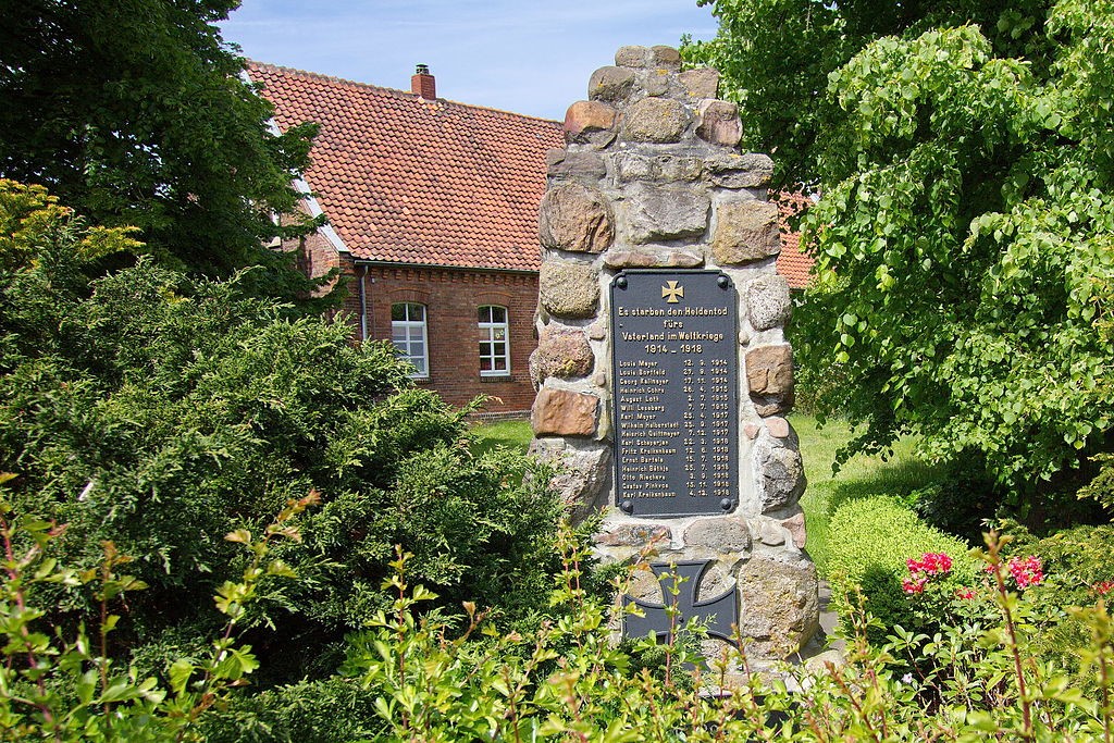 Aus Feldsteinen aufgemauertes Ehrenmal, eingelegte Gusstafel mit Inschrift, darunter ein Eisernes Kreuz
