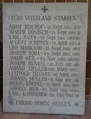 Fahrer | KAMMERER | Karl | 18.03.1893 Wernarz, Ufr. | 28.10.1918 in Brüssel | KB 11. Feldartillerie-Regiment, 6.Batterie | gestorben infolge Krankheit – Verlustlisten denkmalprojekt.org; Kriegsgräberstätte in Brüssel-Evere: Block 2 Reihe 21 Grab 445 |