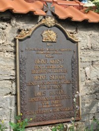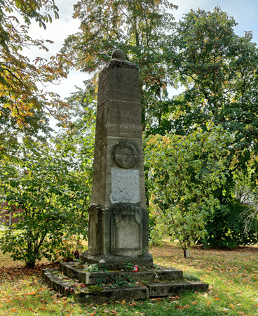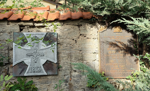 Links davon ist eine Mauer, an der die Gedenktafeln für die Feldzüge 1813 und 1870/71 angebracht sind.