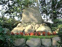 In einer kleinen Anlage ein großer Findling mit Inschrift und den Namen von 21 Kriegstoten beider Weltkriege.
