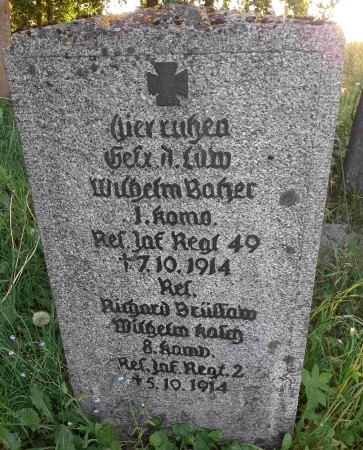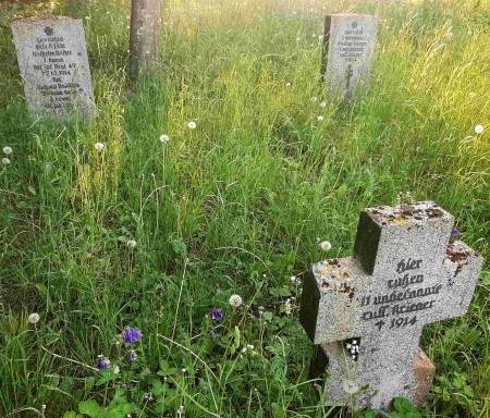 Kriegsgräber für Gefallene des Ersten Weltkriegs auf dem alten evangelischen Friedhof: Drei Grabsteine für fünf deutsche Soldaten (darunter zwei unbekannte) und 12 unbekannte russische Soldaten.