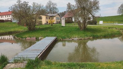 Ein Steg führt zur Denkmalstele in der Mitte der Insel im Dorfweiher.