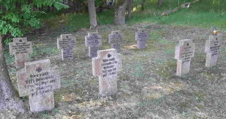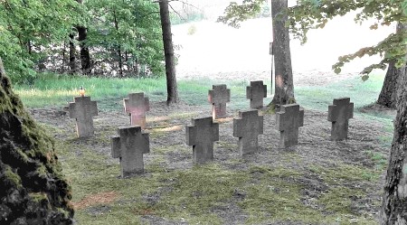 Kriegsgräberstätte für Gefallene des Ersten Weltkriegs auf dem alten evangelischen Friedhof südöstlich des Ortes: Neun Steinkreuze stehen am Rande des abgeräumten Friedhofsbereichs. Ein Schild in polnischer Sprache weist auf 13 hier bestattete deutsche Soldaten hin. Einer ist unbekannt.