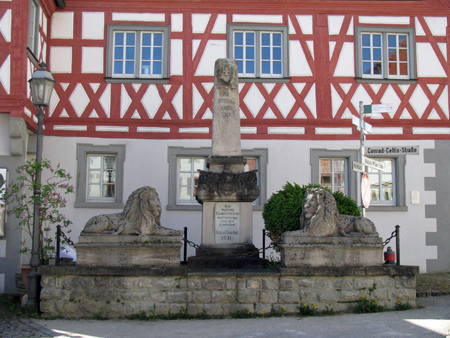 Standort des Denkmals ist am Marktplatz, bestehend aus einem Sockel mit Inschriften und einem aufgesetzten Obelisken. Davor zwei liegende Löwen.