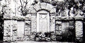 Ehemaliges Denkmal für die Gefallenen des Ersten Weltkriegs aus Natursteinblöcken gemauert mit eingelassenen Widmungs- und Namenssteinen. Mittelteil mit Widmung und Stahlhelm-Relief erhöht mit Rundbogen. Seitenflügel halbrund mit den zwei Namenssteinen und EK-Zeichen auf den Endpfeilern. Das Denkmal wurde nach 1945 abgerissen.