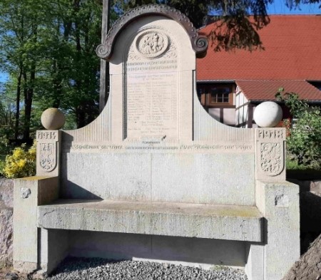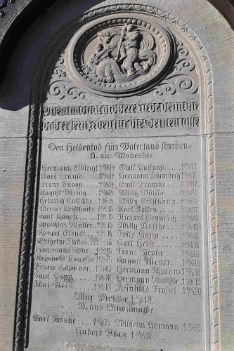 Denkmal für die Gefallenen des Ersten Weltkriegs vor der Kirche: Steinbank mit erhöhtem Mittelteil mit der Widmung und den Namen und dem Relief von St. Georg mit dem Drachen.